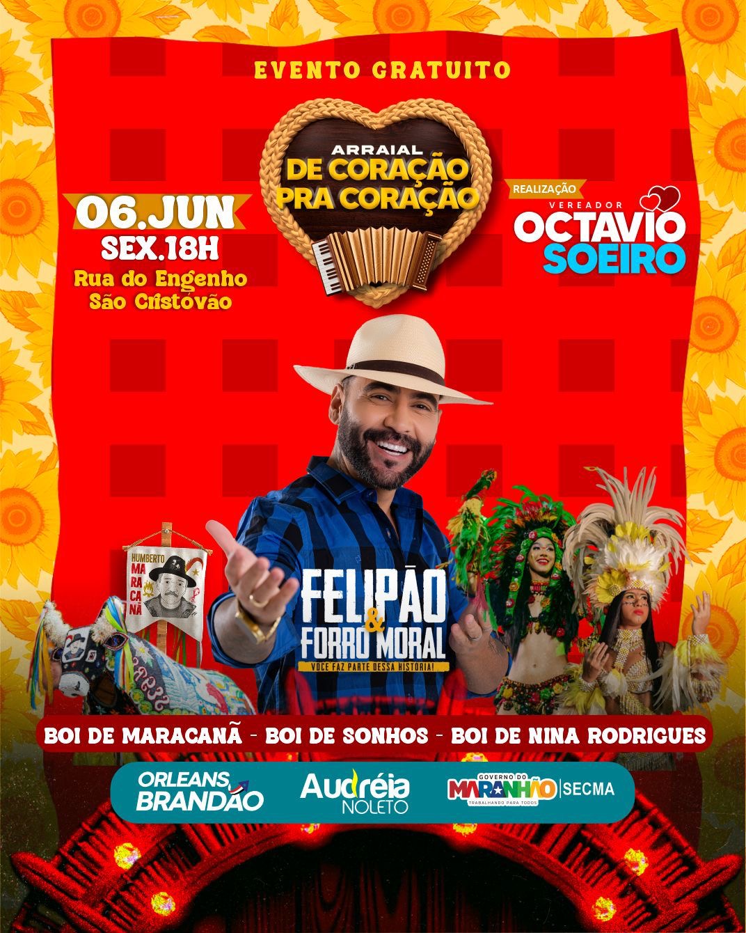 O vereador de São Luís, Octávio Soeiro (PSB), anunciou, neste sábado (24), as atrações de mais uma edição do Arraial “De Coração Pra Coração”, que será realizado no dia 06 de junho, na Rua do Engenho, São Cristóvão.