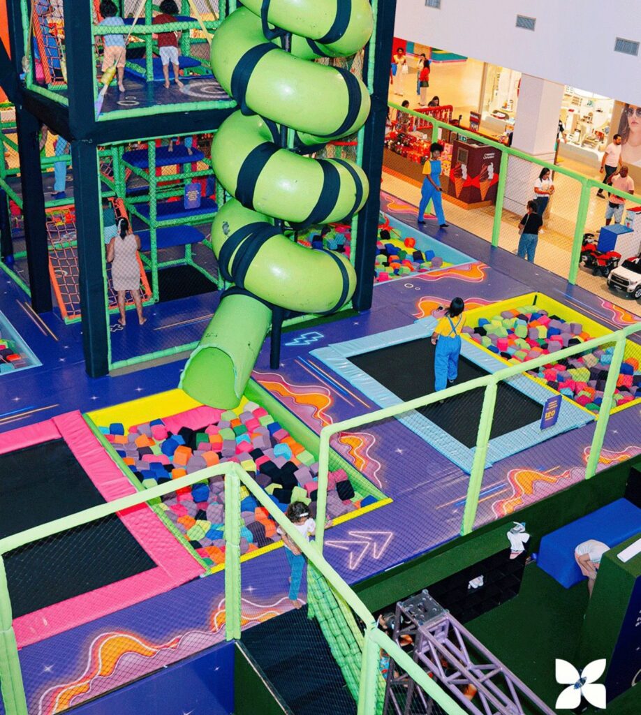 Instalada em uma estrutura vertical, a Arena Multi 360 oferece um percurso que inclui escorregadores, tobogãs em espiral, redes de escalada, trampolins, piscinas de espuma e obstáculos, permitindo que as crianças explorem diferentes desafios ao longo da experiência. A proposta é proporcionar uma vivência dinâmica, que combina atividade física, ludicidade e interação.