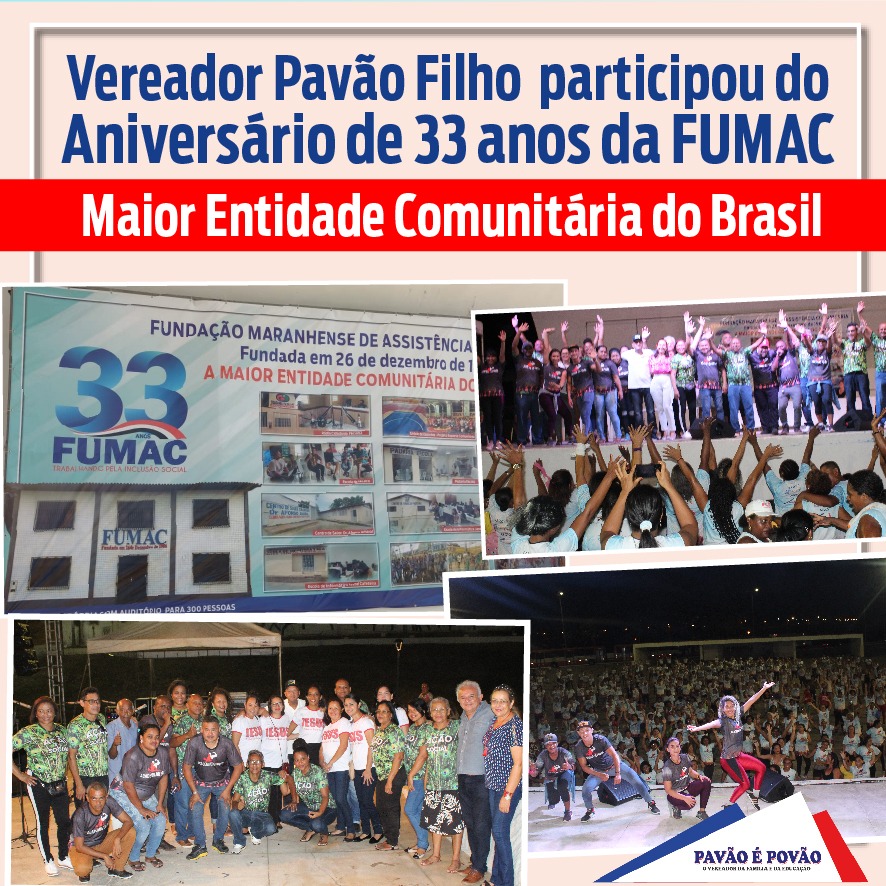 O Vereador Pavão Filho, participou do aniversário de 33 anos da Fundação Maranhense de Assistência Comunitária –FUMAC, fundada em 26 de dezembro de 1986, considerada a maior Entidade Comunitária do Brasil. O Evento de celebração do aniversário da Fundação aconteceu na Praça Maria Aragão, no dia 26 de Dezembro, com
