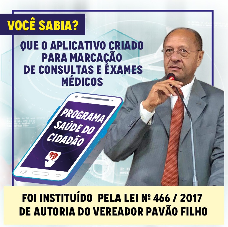 A Lei Nº466/2017 de autoria do Vereador Pavão Filho, que cria um Aplicativo Móvel nominado de “Programa Saúde do Cidadão” facilitará a vida de milhares de pessoas, diminuindo os sofrimentos das filas e a demora no atendimento . A marcação de Consultas e Exames Médicos, através de um aplicativo será